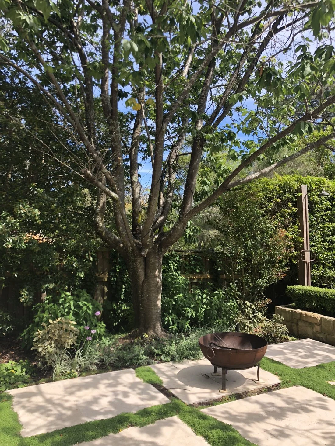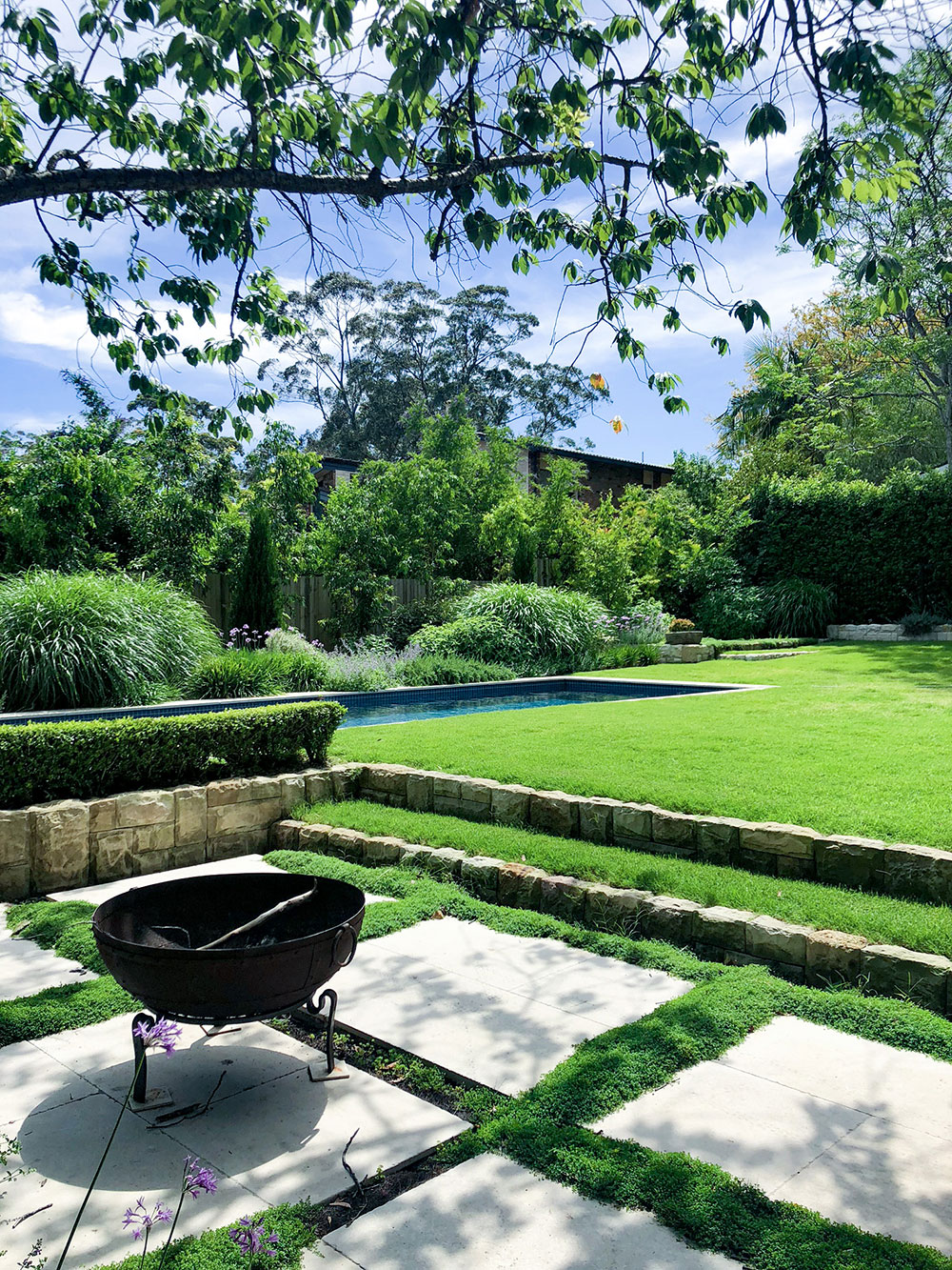 The largest part of the garden is a rectangular lawn bordered by sandstone edging and retaining walls, limestone paved paths and large format limestone steppers. Although it was to be, above all, a family garden with a large lawn, the clients also wanted certain contemporary elements.