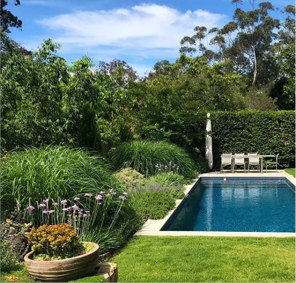 A large scale pool nestles at the rear of the backyard, engulfed by abundant, textural planting. When a house has generous proportions, it is only logical that the swimming pool landscape should reflect a similar grand scale.